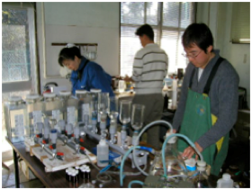 鉄筋二階建(総面積314㎡)、一階には実習室・暗実験室、調査機器倉庫があります。実習室は最大40名の実習が可能で、実体顕微鏡と生物顕微鏡をそれぞれ30台完備するとともに、海水の常時使用が可能です。二階には事務室、センター長室、会議室、研究室1、2、3の各部屋があります。