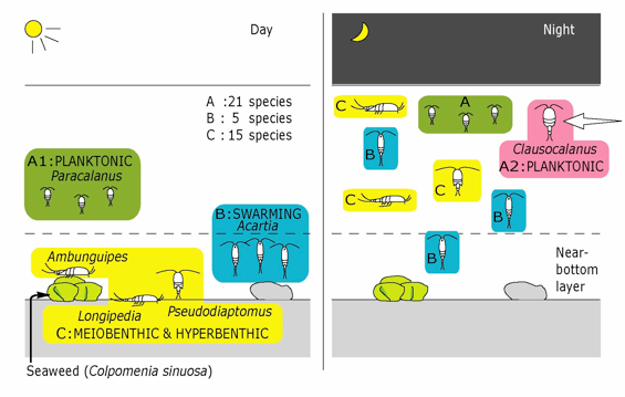 亜熱帯表層の動物プランクトンは、主に体長1mm前後の小型のカイアシ類により構成されており、その生活史は季節性に乏しく、周年再生産を行っていると考えられている。しかし、亜熱帯性のカイアシ類のうち、Calanidae科とEucalanidae科に属する大型種において、亜寒帯海域で優占する同属種と同様に「成長に伴う鉛直移動(OVM)」を行う生活史戦略が明らかとなりつつある。これらの研究結果から、亜熱帯海域の新生産のある部分は時空間的に突発的・局所的な現象で支えられ、2次生産者である動物プランクトンのうち大型のカイアシ類は、これら非定常的新生産を有効に利用するため、成長に伴う鉛直移動に代表される特異的な生活史戦略を獲得している可能性が予想される。